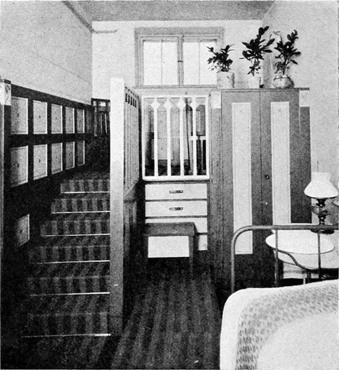 Auf Licht und Luft also kommt es an. Man wird sich daher helle Farben wünschen, die Wände ganz licht, die Betten und Schränke in hellgelbem Kirschholz, oder weiß lackiert, oder in unverhüllter Naturfarbe, wobei man die Flächen durch Einsetzen anders färbiger Holzstücke beleben kann. Sonst hat man gerne eine Ottomane dem Bette am Fußende vorgelegt, ja mit diesem auch in einem konstruktiv verbunden. Hat man einen besonderen Toilettenraum, dann brauchen Wäsche- und Kleiderschränke nicht im Schlafraume stehen. Die Einrichtung der modernen Schränke dieser Art ist für den Inhalt genau ausgemessen. Der Hängeraum muß so hoch sein, um die Röcke gut aufnehmen zu können. Oberhalb derselben im Inneren befindet sich häufig auch ein Brett für die Hüte. Die Hosen und Westen werden in die breiten Laden gelegt. Eine Lade für das Schuhwerk befindet sich zu unterst. Kleinere separate Laden und Fächer sind da für Spitzen, Bänder, Kravatten, Handschuhe, Krägen, Manschetten etc. Für die Schmutzwäsche gibt es einen truhenähnlichen Behälter, der im Vorzimmer steht und häufig als Sitzgelegenheit ausgenützt ist, mit einem Deckel oben zur Aufnahme der Schmutzwäsche und der von unten aufklappbaren Vorderseite zur Herausnahme derselben; alles versperrbar, natürlich.