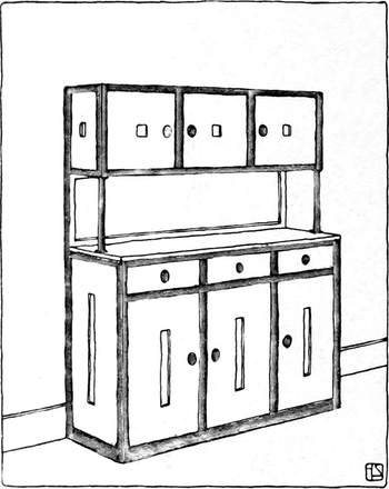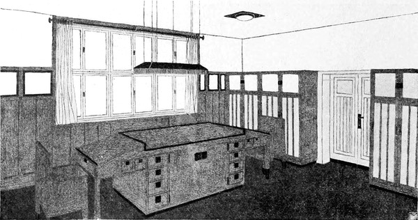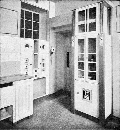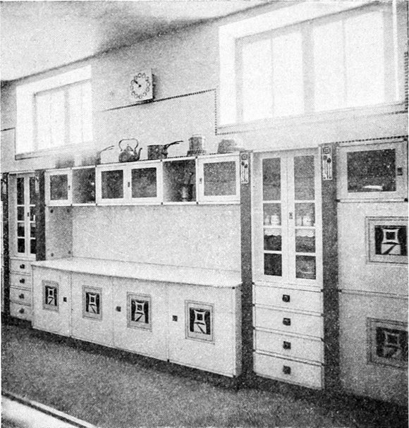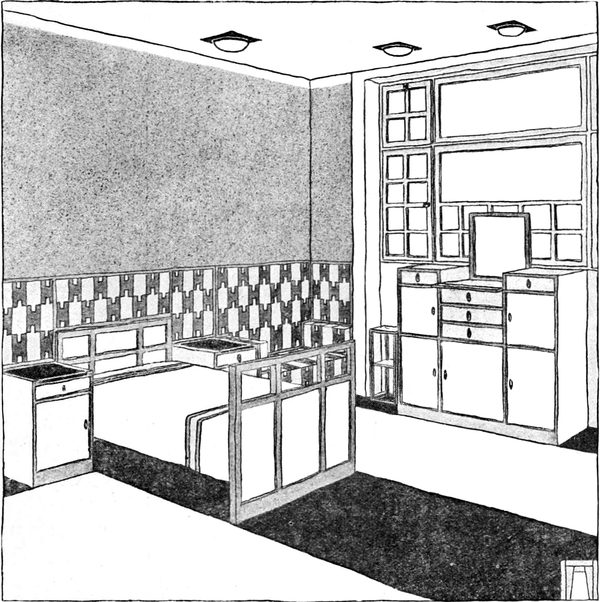 Gegenüber den alten Küchen, so vollkommen sie auch mit Gerätschaften versehen sein mochten, haben die heutigen, von modernen Architekten eingerichteten Küchen entschieden bedeutende Vorzüge aufzuweisen. Das Gebot der Zweckmäßigkeit und sanitäre Rücksichten[S. 52] erfordern, daß die Küchen hell seien, in modernen Landhäusern legt man daher die Fenster breit und ziemlich hoch an, selbst wenn dies nicht durch die tiefe Lage des Raumes im Souterrain erforderlich sein sollte, damit die Wandflächen für die Kücheneinrichtung gut ausgenützt werden können. Unter diesen Fenstern befinden sich in der Regel die Schränke mit möglichst viel Laden und Stellagen, die mit Glastüren verschlossen sind. In der Mitte der Wand, unterhalb der Fenster finden wir häufig den Anrichtetisch, in seinen Unterteilen als Schrank ausgenützt und von einem Gesims mit verschließbaren Fächern gekrönt. Auf der gegenüberliegenden Seite steht der Herd. Im Gegensatz zur Küche von einst, die man erst dann für schön erachtete, wenn das blitzblanke Messing- und Kupfergeschirr, die bunten Töpfe aus Steingut und Porzellan, die Zinn- und Blechgefäße an Wänden und offenen Stellagen zum Entzücken der Hausfrau prangend ausgestellt waren, liebt man es heute, jegliches Küchenrequisit in den Schränken abzuschließen und hat damit vollkommen recht. Denn so kann das Geschirr von Staub und Fliegenunrat frei gehalten werden und man erspart ein Übermaß von Reinigungsarbeit. Nur das Kupfergeschirr läßt man frei hängen. Eine solche Küche sieht aber auch appetitlich genug aus, namentlich, wenn die Wände weiß verkachelt sind, wie das neuestens oft der Fall ist. Bis zu einer gewissen Höhe wenigstens sollen die Wände verkachelt sein, soweit eben spritzendes Wasser reicht. An Stelle der Kacheln werden auch dünne Marmorplatten verwendet und zwar nur weiße, weil es aus begreiflichen Gründen Grundsatz ist, daß weiß vorherrsche. Darum werden sämtliche Holzgegenstände, also die ganze Kücheneinrichtung weiß lackiert, wobei man den Vorteil hat, durch einfaches Abwaschen jeden Schmutz leicht zu entfernen. Daß man auf weiß jede Unreinlichkeit[S. 53] sofort sieht, ist nur ein Vorzug, denn sie soll nirgends und am allerwenigsten in der Küche geduldet werden. Will man durchaus ein Ornament, so soll es nur ein Flachornament sein, aufschablonirt und sparsam angewendet. Jede Schnitzerei ist zu verpönen, sie wirkt nur als Staubfänger. Im Übrigen hat man Bedacht auf gradlinige einfache Formen ohne Gesimse, und auf einfache ungeteilte Holzflächen, die durch bloßes Abwischen rein gehalten werden können. Die Küchenmöbel sollen mit ihrer Fläche bis auf den Fußboden herabgehen und auf diesem ohne Füße fest aufstehen, damit sich unterhalb der Schränke keine unkontrollierbaren Schmutzwinkel bilden können. Dagegen tut man gut, die Stuhl- und Tischflächen, die oft gerieben werden müssen, überhaupt nicht zu streichen, sondern bloß fein gehobelt im ursprünglichen Holzton stehen zu lassen, und so einzurichten, daß sie abnehmbar sind. Auf diese Art können sie am besten gewaschen und gerieben werden, wovon das Holz bald ein blühweißes Aussehen bekommt. In Bezug auf den Fußboden hat man auch zu bedenken, daß in Küchen immer Wasser verschüttet wird, und daß er mit Wasser abgeschwemmt und solcherart leicht gereinigt werden soll. Darum wird man den Steinboden dem bisherigen Brettelboden vorziehen. Der Steinboden aber bedeutet einen Angriff auf die Gesundheit der Köchinnen, die ohnehin meistens gichtisch sind. Da bietet denn das Xylolith einen Ausweg. Xylolith ist ein Kunststein, der auf Holz aufgetragen wird, nicht so[S. 54] hart wie Naturstein ist, aber sonst alle seine Vorzüge aufweist und noch mehr. Er ist nämlich schon in allen Farben zu haben und man kann ihn nach seinem persönlichen Geschmack wählen. Zu dem blinkenden Weiß der Wände passt sehr gut ein roter oder blauer Xylolithboden.
