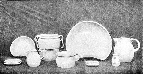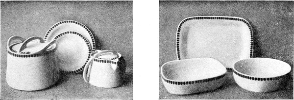 Dem Glase steht das Porzellan zunächst. Ich weiß, daß die meisten Leute buntbemaltes Geschirr lieben. Es macht zwar nicht viel aus, ob[S. 61] das Geschirr bemalt ist oder einfach weiß, nur ist zu bedenken, daß die Bemalung häufig Schäden des Porzellans verdecken muß. Reliefartiger Dekor am Tellerrand ist im höchsten Grade unzweckmäßig, aber alles Unzweckmäßige ist am häufigsten anzutreffen. Ganz weißes Geschirr ohne bunte Streifen ist sehr vornehm in der Wirkung, aber merkwürdigerweise selten im Gebrauche zu finden.