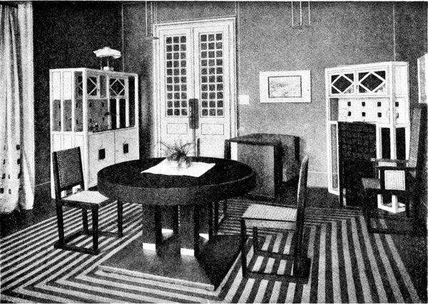 Auch der Teppich ist auf diese anheimelnde einfach vornehme Gesamtwirkung gestimmt. Es ist aber durchaus nicht »stilwidrig«, in einem solchen Raum einen echten Perserteppich aufzubreiten. Überhaupt was ist Stil? Wenn irgend ein antikisierender in Holz geschnitzter Fries, bald auf Schränken und Betten aufgetragen und auseinandergezerrt und dann wieder auf Nachtkästchen schmal zusammengedrängt wird, so nennt man das im Möbelhändlerverstande »stilgerecht«. Wenn aber jemand in seiner Wohnung heterogene Dinge zusammenträgt, die ihrer[S. 37] Entstehung nach, räumlich und zeitlich, sehr getrennt sein mögen, aber durchaus echt sind, so ergibt sich vermöge dieser Echtheit eine gewisse Einheit und diese Einheit kann man füglich Stil, vielleicht den einzig wahren und naturgemäßen Stil nennen. Darum beleidigt es unser Empfinden nicht, wenn wir in der neuen Wohnungs-Ausstattung einen echten Perser und an den Wänden gar echte Gobelins vorfinden. Die orientalischen Teppiche haben schöne geometrische Muster und die liegen uns ästhetisch wahrhaft näher, als alle plumpen Pflanzenstilisierungen, die man in der wohlfeilen Teppichfabrikation antrifft. Überdies hat die Moderne auch passende Teppiche geschaffen, die in ruhigen Farben gehalten sind, eine strenge geometrische Zeichnung oder irgend eine phantasievolle Linienführung aufweisen und die Stimmung solcher Räume harmonisch abschließen, Teppiche von Kolo Moser, Josef[S. 38] Hoffmann, Josef Olbrich, Leopold Bauer, Peter Behrens, Max Benirschke u. v. a.