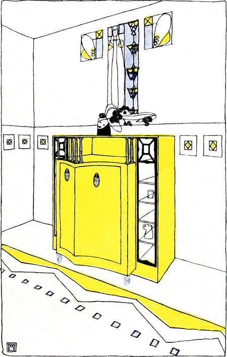 5. Welches Holz soll man verwenden? Es ist klar, daß die dekorative Verwendung von Materialien zwingt, streng und einfach zu sein; aber der Strenge des Stils kann durch eine glückliche Wahl des Holzes entgegen gewirkt werden. Nußholz würde zu schwer im Ton sein und Eiche zu steif und unbiegsam in Substanz und Masse. Was man braucht, ist ein leichteres Holz, freundlicher von Aussehen, und so scheint es nach mancher Überlegung und manchen Versuchen empfehlenswert, Zuflucht zu Kirschholz zu nehmen. Es hat eine schöne Textur, der Ton ist hell, warm, freundlich und es hat auch eine Art von häuslicher Eleganz. Von ebenso glücklicher Wirkung sind weißlackierte Möbel. Zu ihrem Lobe kann nicht genug gesagt werden. Und wenn nun das Werk vollendet ist und die Morgensonne in das Zimmer tritt, so wird man das Zimmer heimlich und traut finden, als einen freundlichen Raum, sich darin anzukleiden und dem Tag einen guten Anfang zu geben.