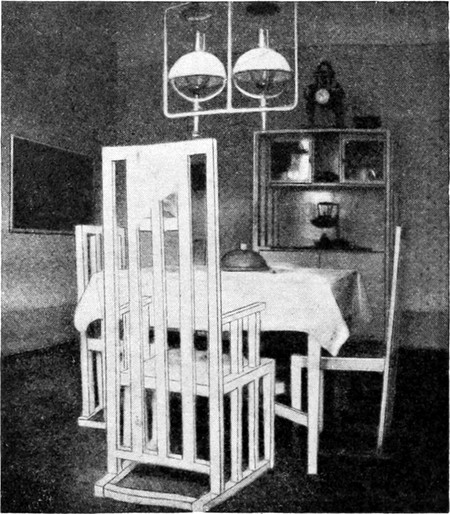 Beim Stuhl begann die Revolution. Man verlangte, daß er Bequemlichkeit gewähre, und bestimmte die Sitzhöhe nach dem körperlichen Maß. Eigentlich hat man das auch in Goethes Zeiten getan und vielleicht schon zu Moses Zeiten, aber man hat seit der Zeit, da man fremde Stile kopierte, darauf vergessen. Die Querleisten zwischen den Beinen wurden[S. 67] als lästig empfunden und blieben weg. Dann kam die Lehne in Betracht. Hiebei ist die Atmung zu berücksichtigen. Geht die Lehne im Bogen, so muß sie unter den Schultern abschließen, sonst verursacht sie Atembeklemmungen. Geht sie höher, so schließe sie besser gerade ab. Doch soll sie möglichst niedrig sein, sonst bildet sie ein Hindernis beim Servieren. Von der Stuhlform hängt der Tisch ab. Die richtige Höhe ist bei Speisetischen sehr wichtig. Ausziehtische sind natürlich bevorzugt, wenn sie auf guten Rollen laufen. Die Zarge darf nicht so weit herabreichen, daß sie das Knie des Sitzenden beengt. Die Querstangen sind absolut zu vermeiden. Man hat neuestens den Tischfuß mit gehämmertem Messing umkleidet, darauf man unbekümmert die Füße stellen kann. Buffet, Teetisch, Serviertisch ergänzen das Mobilar. Das Ornament besteht höchstens in eingelegten Linien, im flachen Dekor. Glatte polierte Formen, die anmutige Reflexlichter erzeugen, den Glanz des Silberzeugs, die Weiße des Porzellans widerspiegeln, sind durchaus beliebt. Die[S. 68] Tafelaufsätze sind niedrig, einfach und zweckvoll. Den Hauptschmuck bilden die Blumen, auf der Tafel und am Fenster. Dort hängen keine Stoffgardinen mehr, die Rembrandtstimmung ist dahin, alles ist auf Luft und Licht und Farbe gestimmt, auf helle, freundliche Farben. Durchsichtige Gardinen, seitlich aufzuziehen, hängen in geraden Falten herab. Die Wände sind natürlich auch hell, keine Tapeten, keine Dessinierung. Perlgrau zum Beispiel. Das Möbelwerk gebeizt oder lackiert. Mahagoni ist schön und teuer. Rot gebeiztes Holz tut es auch. Stühle und Tisch in diesem Ton, dagegen die Buffets, die Kaminverkleidung, der Blumenständer etc. weiß lackiert. Das gibt einen schönen Akkord. Unter Kaminverkleidung verstehe ich die Umhüllung des Gaskamins, mit Fächern zur Aufnahme von allerlei Kleinkunst. Für den Bodenbelag findet man heute schon gutes und billiges Zeug in geeigneten Farben, entweder einfärbig oder gestreift oder sonst mit einem ruhigen Linienornament. Wo elektrisches Licht ist, hat man den Vorzug einer gleichmäßig verteilten Deckenbeleuchtung. Auch bei den Beleuchtungskörpern lasse man es nur auf reine Zwecklichkeit ankommen und verschmähe allen ornamentalen und figuralen Kram, der sich in dieser Form immer wieder anpreist. Erst wenn man von jedem Ornament absieht, wird man zu ruhigen, einheitlichen Wirkungen und zu einer stillen und vornehmen Schönheit gelangen. Wenn man einmal so weit sein wird, die Farbe zu würdigen, die ungebrochenen einfachen Farben, nicht die schmutzig aussehenden, dann wird man im Raum glückliche Ergebnisse erzielen, die man nur andeuten kann.