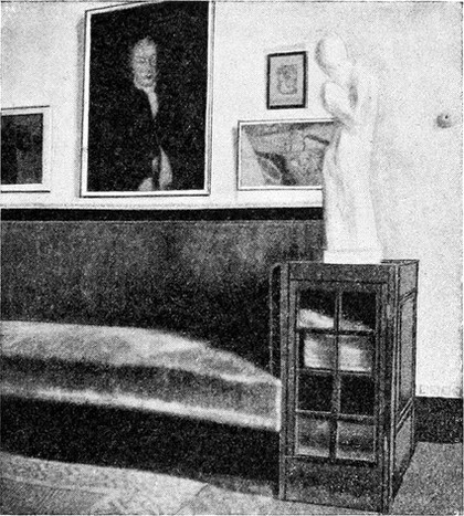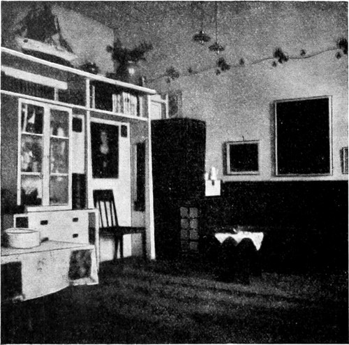Ich meine aber durchaus nicht, daß man die Sache nachahmen dürfte. Sie ist nur deshalb sympathisch, weil sich in ihr überhaupt ein[S. 78] Gestaltungsgrundsatz geltend macht. Im Übrigen könnte man sehr viel Gegenteiliges einzuwenden haben, denn eine Sammlung von Kunstblättern gehört doch viel eher in die Mappe, die man nur in musenfreundlichen Stunden dem schönheitsuchenden Auge erschließt, und dann genügt dieses briefmarkenähnliche Aufkleben nicht mehr dem modernen Formsinn. Außerdem möchte ich der Gefahr begegnen, daß man meine Sympathie zugunsten jener wigwamartig mit Trophäen behängten Schauspielerwohnungen auslegt, wo die Wände über und über mit Photographien in protzigen Goldrahmen bepflastert sind, die das liebe Ich, von vorn und hinten gesehen und in allen möglichen und unmöglichen Lebenslagen variiert, möglichst aufdringlich zur Schau stellen. Diesem indianerhaften Zustand möchte ich nicht einmal den Schein eines freundlichen Arguments gönnen.