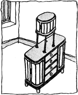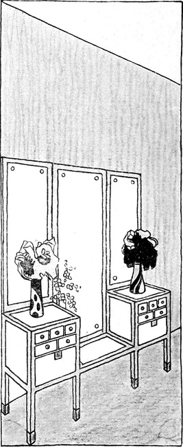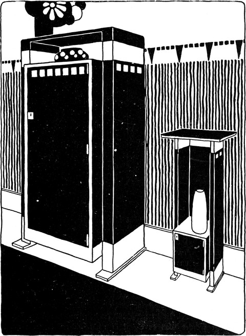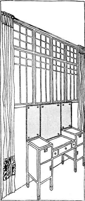 Das Nachtkästchen gibt ebenfalls Möglichkeiten zu neuen sinngemäßen Lösungen. Man kann einen kleinen, glasschrankartigen Aufsatz damit verbinden, der die Hausapotheke aufzunehmen hat. Leichte, helle[S. 133] Vorhänge, seitlich aufzuziehen, schützen das Gemach gegen Blicke von außen her, sperren aber nicht das Licht aus. Vor dem Fenster steht die Toilette: ein vertikaler Spiegel mit zwei im Winkel stehenden Flügeln, ein Gesimse davor, und links und rechts vom Sitz kleine Laden für die gesammte Kosmetik. Das alles ist sehr zierlich, sehr einfach, sehr elegant.