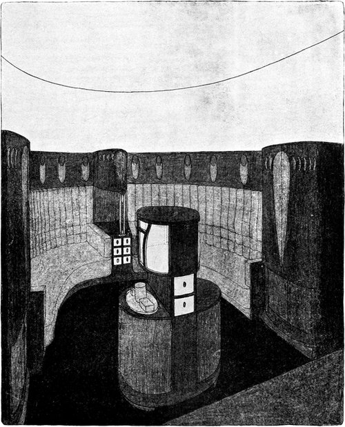 Vor Jahren sah es freilich noch anders aus. Wie es in den meisten Wohnungen heute noch aussieht. Altdeutsch war es, oder was man darunter versteht. Der Plüschdekorationsdivan trug die ach so bekannten Dekorationsteller. Die altdeutsche Kredenz war geschnitzt, zwar sehr roh und albern, aber im großen und ganzen trug das Möbel eine Façade wie ein italienischer Palazzo. Säulen waren an jedem Türchen, aber sie hatten nichts zu stützen. Sie waren angeklebt und bewegten sich mit der Tür auf und zu. Ich erzähle das nur, um auf den Widersinn einer solchen Ornamentik, die man an jedem derartigen Möbel finden kann, gebührend aufmerksam zu machen. Die anderen Einrichtungsstücke paßten dazu — insofern waren sie wirklich »stilgerecht«. Der massive Speisetisch hatte unten eine kreuzweise Verspreizung, so daß man nie recht wußte, wie man die eigenen Beine unter dem Tische unterbringen soll. Es war zu wenig Platz, und sie auf die Verspreizung zu stellen, litt die Hausfrau nicht. Die üblichen Speisezimmersesseln standen herum, mit Sitzflächen aus Holz, das figurale Ornamente eingepreßt hatte, so daß man sich nicht niedersetzen konnte, ohne sich einer schönen Marke mitten ins Gesicht[S. 65] zu setzen — herrlich! Natürlich war auch ein Pfeilerspiegel da mit Trumeau, dunkle Vorhänge, um alles in allem die beziehungsreiche, wurstrot- und sauerkrautfarbene Gesamtstimmung zu erzeugen, die seit einer Generation in Speisezimmern so beliebt ist.