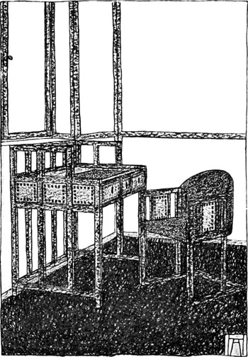 Die Möbel sind ganz einfach, aus weichem Holz, gut und sorgfältig gemacht, in geraden Leisten und Brettern zusammengefügt. Reines, einfaches Tischlererzeugnis — ohne Künstelei. Die Farbe kann an solchen Möbeln, wofern sie nur in guten und richtigen Verhältnissen hergestellt, alle Schönheit hervorbringen. Überhaupt müßte die Schönheit des Raumes[S. 174] zum Teil in der farbigen Wirkung gesucht werden. Das weiche Holz läßt sich auf verschiedenartige Weise beizen und man könnte zu dem Weiß der Wände einen graublauen Holzton oder einen dunkelblauen oder kirschroten vorteilhaft verwenden, von zahllosen anderen Abstufungen nicht zu reden. Man vermeide durchaus, irgend ein Zierrat anbringen zu wollen. Schönheit kommt aus der zweckvollen Durchbildung, aus der schönen Proportion der Masse und endlich aus der glücklichen Farbenwirkung. Nur ein paar Haupttöne sollen vorherrschen. Nebst dem Weiß der Wände irgend ein kräftiger farbenfroher Ton an den Möbeln, der auch die einfachsten Stücke bedeutsam macht und den Sinnen näher rückt. Man ahnt für gewöhnlich gar nicht, wie leicht die Sinne auf die farbige Erscheinung reagieren. Weißlackierte Möbel, wie die hier abgebildeten, sind das Kennzeichen einer ganz feinen Kultur. Für billigen und echt künstlerischen Wandschmuck hat der Verlag Teubner und Voigtländer, Leipzig, in vorzüglicher Weise gesorgt.