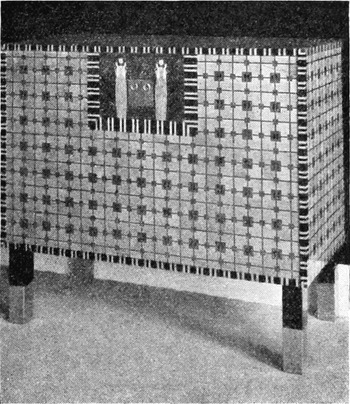 Die bildmäßig dekorative Verwendung anderer Materialien, wie etwa getriebene Paneele in Messing, Kupfer oder Silber, die Kachelschnitte, Mörtelschnitte, Mosaikbilder, Email und Perlmutter etc., die in die Mauer eingelassen werden, kann nur im eigenen Wohnhaus in Betracht kommen, wo der Kunst ein viel größerer Spielraum gegeben ist.