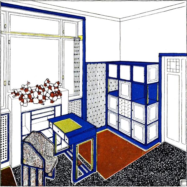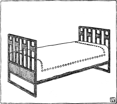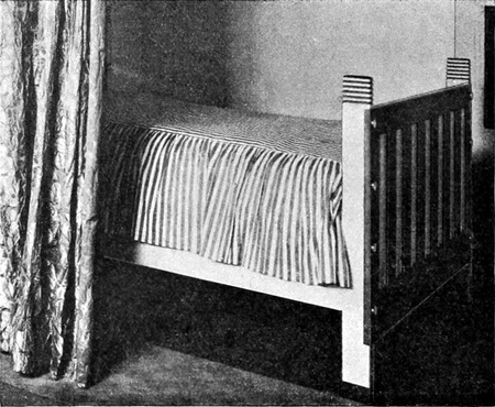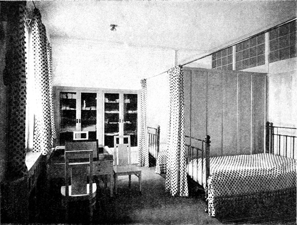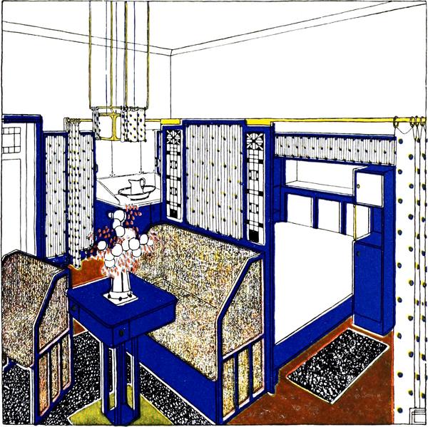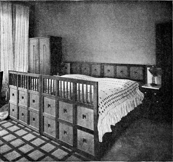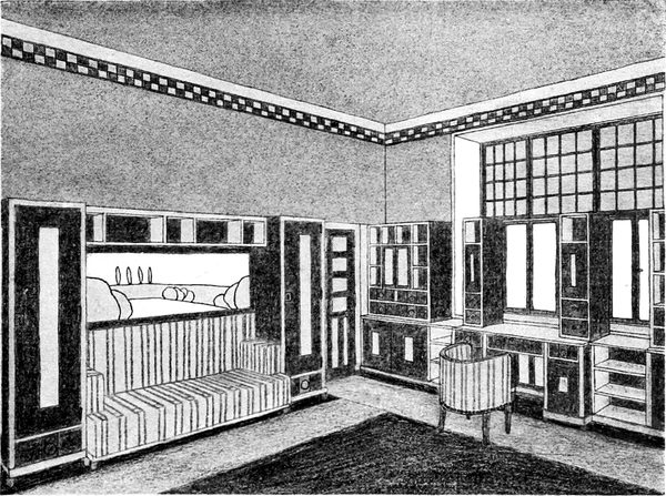 3. Die bisherigen Betrachtungen haben rasch über die Grundzüge des Entwurfes belehrt. Die Notwendigkeit, die man fühlt, das[S. 128] Zimmer weiter, geräumiger und luftiger erscheinen zu lassen als es wirklich ist, führt mit der Logik des gesunden Menschenverstandes zu verschiedenen praktischen Lösungen. Man entscheidet sich zum Beispiel, keine gemusterte Tapete zu nehmen. Wenn eine Wand über und über gemustert ist, so lockt sie von allen Standpunkten die Aufmerksamkeit auf sich, sie scheint sich dem Auge dadurch näher zu bringen und dem Raum einiges von seiner Länge und Breite zu rauben. Man entscheidet sich auch dafür, daß die Einrichtung nicht mehr Raum einnehmen darf, als unbedingt erforderlich ist; daher muß die handwerkliche Leistung die höchsten konstruktiven Vorzüge aufweisen, damit man den höchsten Grad von Annehmlichkeit und Zweckmäßigkeit mit dem geringsten Aufwand von Holz erreicht. Nachdem das Zimmer ein Schlafzimmer ist, hat man ganz recht, das Bett als das wichtigste Möbelstück zu betrachten, und es aus Holz herzustellen, teils weil gut gearbeitetes Holz so schön und ruhig harmonisch wirkt, teils weil Messingbetten nicht immer mit den Farben übereinstimmen, welche man im Auge hat, und endlich, weil sich Metall zu frostig anfühlt. Das[S. 129] Bett wird nicht so niedrig sein, daß sich die Magd versucht fühlen könnte, die Reinigung des Fußbodens darunter zu vernachlässigen, noch wird es so hoch sein, daß der Raum zwischen Matratze und Fußboden als Speicher für Schachteln und für Staubansammlung geeignet erscheint. Wenn man zum Schluß das Schlafzimmer als Krankenzimmer auffassen will, ist der Grundsatz der Wohnlichkeit unerläßlich, ebenso eine ruhige Heiterkeit in der Farbengebung.