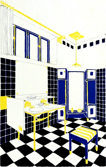 Das Bad ist in unmittelbarer Nähe des Schlafzimmers zu halten. Jede bessere Stadtwohnung hat ihr Badezimmer. Ein regelrechtes Bad, mit seinen weißen glänzenden Kacheln, der vertieften Wanne, den[S. 134] blankgeputzten Hähnen in der Marmorverschalung, den glänzenden Apparaten, den technisch vorzüglich eingerichteten Waschtischen sieht immer einladend aus. Im Schlafzimmer kann man sodann den Waschtisch entbehren. Gerade was die Badeeinrichtung angeht, so haben wir eine unbescholtene Vergangenheit. In den glanzvollen Zeiten des Hausrats von der Gothik bis zum Rokoko ist keine Rede von Badeeinrichtungen. Die »Kunst« befasste sich nicht damit, es blieb eine rein technische Angelegenheit der neueren Zeit, darum haben wir es heute in vollkommen von Stilarchitekturen unbeirrten, praktischen Formen vorgefunden. Nur römische Vorbilder existieren und die sind sicherlich auch mustergiltig. Früher war man weniger heikel in dieser Hinsicht. Heute ist das Bad tägliches Bedürfnis für einen Menschen, der reine Wäsche trägt.