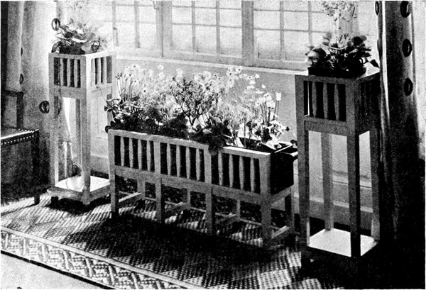 Diese Einrichtung ist schön und praktisch und Lichtwark knüpft daran die Erörterung der Farbe. »Es ist nichts im Wege, daß man neben dem Grün auch Weiß — was sehr günstig ist — und unter Umständen auch Rot verwendet oder Weiß mit grünen, Grün oder Rot mit weißen Querstreifen. Auch Blau, Purpur, Orange und Gelb sind denkbar, aber schwieriger zu verwenden, sobald man es mit mehr als einer Blume zu tun hat. Für größere alleinstehende Zimmerpflanzen sind Topfhüllen in Gestalt schön bewegter und geschmackvoll gefärbter runder Körbe — Korbvasen — ausgezeichnet zu verwenden. Sie sehen gut aus und haben den Vorzug, nicht zu zerbrechen«.