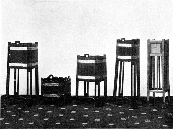 Das wissen alle Hausfrauen ganz gut, daß die reichlich verwendeten Blumenkörbe fast immer absolut geschmacklos und unpraktisch waren. Daß Niemand in seinem Hause einen praktischen und ästhetisch befriedigenden Blumenkorb aufweisen konnte, hatte einen ganz einfachen Grund. Es gab keinen also beschaffenen Blumenkorb. Was bislang für geschmackvoll galt, war ein Blumenkorb mit einem aus imitiertem Astwerk gefertigten Gestelle, womöglich braun gestrichen oder gar bronziert oder sie waren geflochten und hatten Voluten und andere stilvolle Ornamente aus Weidenruten und Flechtwerk aufgesetzt, die als wahre Staubfänger in kurzer Zeit ein scheußliches Aussehen bekamen und ob ihrer augenscheinlichen Zwecklosigkeit in das Gebiet des lächerlichsten Unfugs gehören. Künstler und Kunstgewerbler haben sich in letzter Zeit mit den Formen des Blumenkorbes befaßt. Soweit diese Lösungen bekannt geworden und in den Handel gekommen sind, läßt sich ein bedeutender Schritt zur Zweckmäßigkeit und wohltuenden Einfachheit konstatieren. Formen sind im Handel, die aus Pfefferrohr und Flechtwerk hergestellt, die Ansprüche des guten Geschmackes wohl erfüllen. Aber es liegt immerhin noch ein weites Feld für die Erfindung schöner und praktischer Formen, sowie für die Anwendung geschmackvoller[S. 164] Farben offen. Der große Anreger auf kunstgewerblichem Gebiete, Alfred Lichtwark, erzählt in seinem Buche »Blumenkultur« (das jedermann lesen sollte, ebenso wie alle seine anderen Schriften), daß ihm berichtet wurde, in Hamburg hätte man früher statt der Blumentöpfe vor jeden Fensterflügel einen langen, eckigen Korb gestellt, als Hülle für vier oder fünf Töpfe. Diese Körbe wären innen und außen gestrichen gewesen. Gesehen hat er sie nicht mehr.