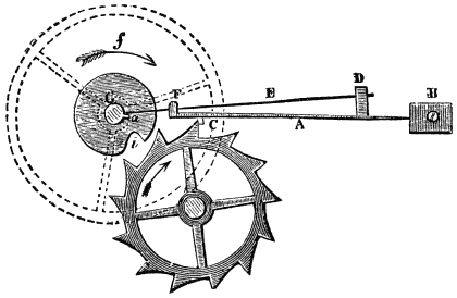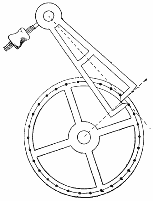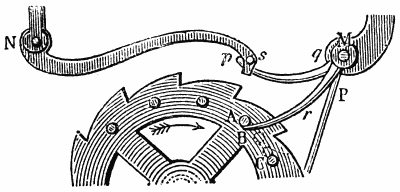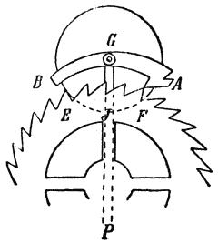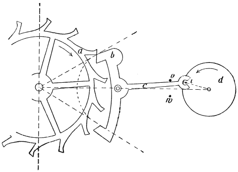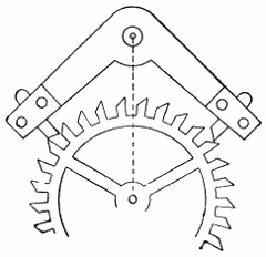 [69] Die Beschreibung, welche Viviani gibt, lautet: „Il quale (das Pendel) stando fermo tratteneva il discender di quello (des Gewichtes), ma sollevato in fuori e lasciato poi in libertà, nel passare oltre il perpendicolo, con la più lunga delle due code annesse allʼimpernatura del dondolo, alzava la chiave che posa ed incastra nella ruota delle tacche, la quale tirata dal contrappeso, voltandosi con le parti superiori verso il dondolo, con uno deʼ suoi pironi calcava per disopra lʼaltra codetta più corta, e le dava nel principio del suo ritorno uno impulso tale, che serviva dʼuna certa accompagnatura al pendolo, che lo faceva sollevare fino allʼaltezza donde sʼera partito; il qual ricadendo naturalmente, e trapassando il perpendicolo, tornava a sollevare la chiave, e subito la ruota delle tacche, in vigore del contrappeso, ripigliava il suo moto seguendo a volgersi e spignere col pirone susseguente il detto pendolo; e così in un certo modo si andava perpetuando lʼandata e tornata del pendolo, sino a che il peso poteva calare a basso.”
