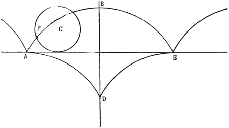 [78] III. Teil, Propos. VI. Wenn der Krümmungshalbmesser einer Kurve diese selbst durchläuft, so beschreibt bei stets wechselndem Krümmungshalbmesser ihr Mittelpunkt eine neue Kurve, die man Evolute nennt; die ursprüngliche Kurve heißt die Evolvente ihrer Evolute. Bei der Cykloide ist nun die Evolute auch wieder eine Cykloide; daher ihre Wichtigkeit für das Pendel. Sie ist kongruent mit der Evolvente, aber um 90° gegen diese verschoben. So z. B. in Fig. 32, wo A B E die Evolvente, und A D E die Evolute derselben darstellt.