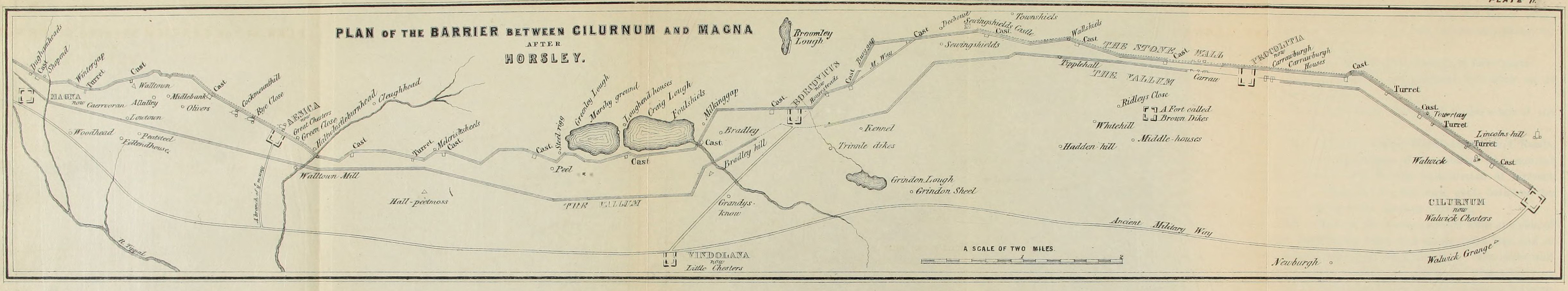 101. Horsley remarks, 'I cannot say that Hadrian’s Vallum has made the south rampart of this station at Housesteads, but I think it has passed it not much to the south, and seems to have a small turn just at the brook, in order to come near, if not up to it.' This looks as if Horsley could not altogether throw off the idea that the works exhibit unity of design. Hutton notices his inconsistency, and, quoting him, (as transferred to the pages of ‘the judicious Warburton,’) writes—‘But can a thing be brought near to what does not exist! Hadrian was dead long before the appearance of this station.’