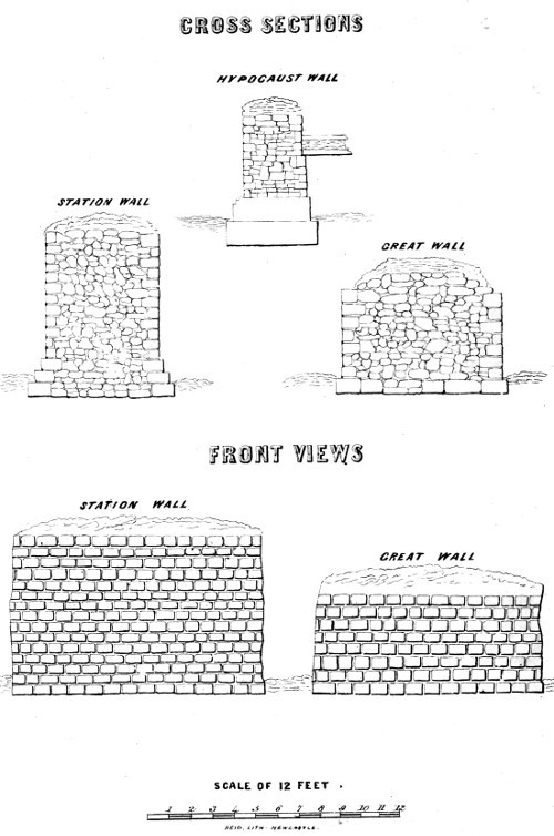 78. Unable to resist the positive testimony of an intelligent eye-witness, I was, at first, disposed to think that he had included in his measurement some chamber on the inside of the station wall. I am now prepared to receive the statement without deduction. Some recent excavations at Risingham have laid bare a part of the curtain wall which has been built double, the intervening space, or chamber, being filled up with rubble and rubbish run together with lime, so as to form a solid mass of masonry of considerable thickness. The object of this arrangement may have been, to form a solid, elevated platform, for the use of the soldiery.