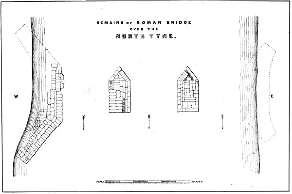 84. The cramps seem to have been of various kinds. Some authors speak of iron cramps. One antiquary, I know, spent a livelong summer’s day knee-deep in the water, extracting one which proved to be entirely of lead. A. cramp, of very curious form and structure, taken from this bridge, is preserved in the museum at Chesters, and is figured Plate VII. fig. 1.; it seems to have been triply dove-tailed; the substance of it is iron, but it has been coated all over to the thickness of one-eighth of an inch with lead. The iron would give the instrument tenacity, and the lead protect the more corrosive metal from oxidization; truly the Romans built for perpetuity.