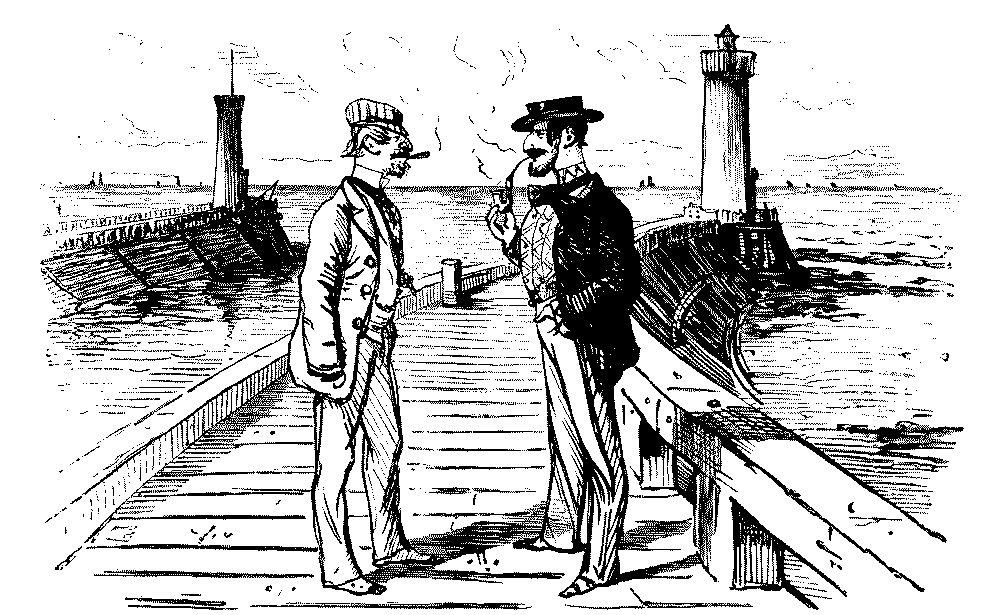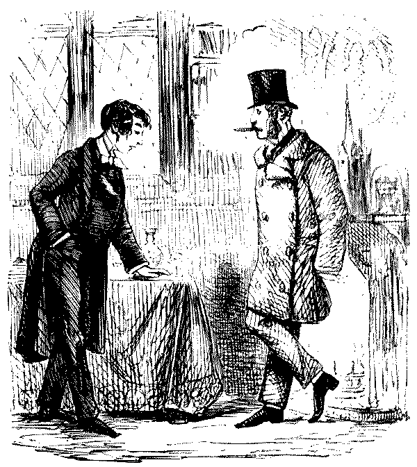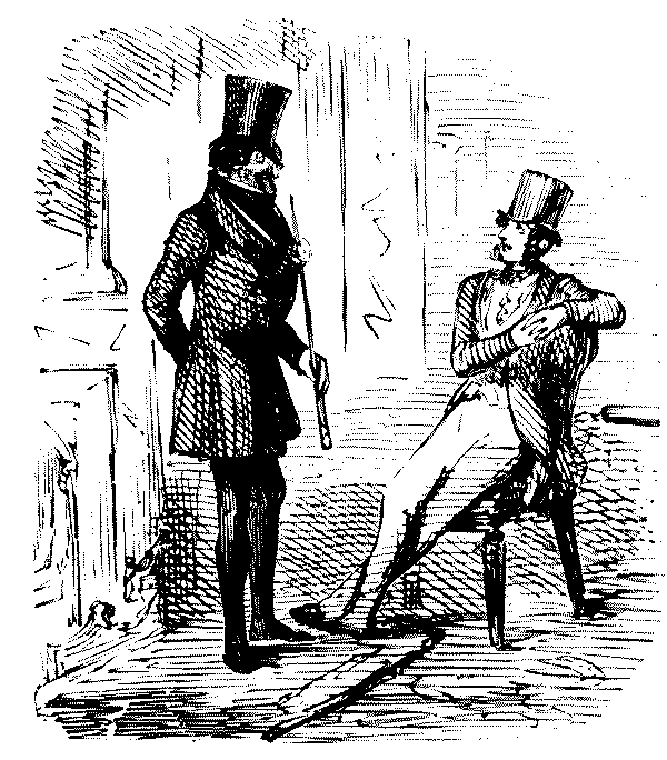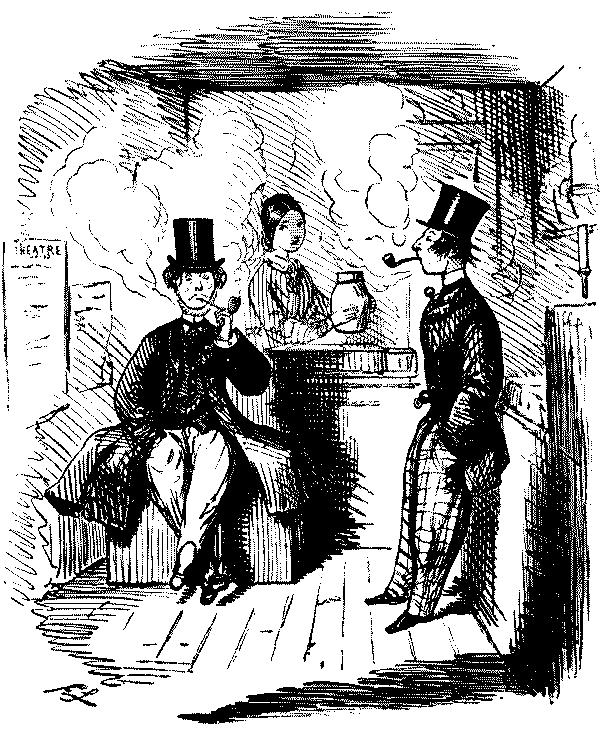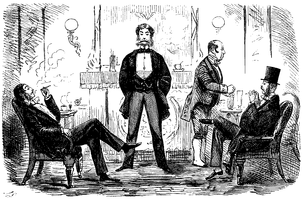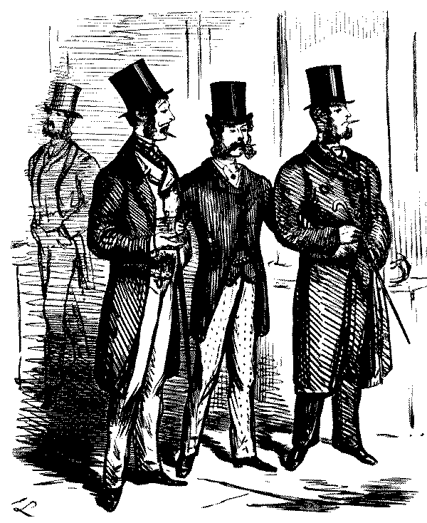 "AW—I WENT THE OTHER NIGHT. BUT, AW—I DON'T KNOW—SOMEHOW, PANTOMIMES ARE NOT WHAT THEY USED TO BE IN MY TIME; AND AS FOR THE GURLS, THERE WASN'T A GOOD-LOOKING ONE IN THE HOUSE."
