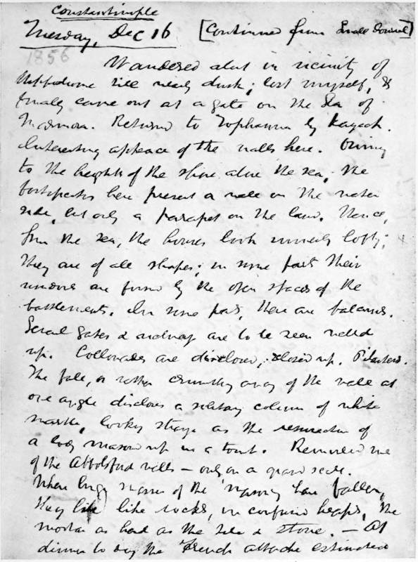 “Setting forth on a bright spring afternoon for a trip to Central Park, the Mecca of most of our pilgrimages, he made a brave and striking figure as he walked erect, head thrown back, cane in hand, inconspicuously dressed in a dark blue suit and a soft black felt hat. For myself, I skipped gaily beside him, anticipating the long jogging ride in the horse cars, the goats and shanty-topped granite of the upper reaches of our journey, the broad walks of the park, where the joy of all existence was best expressed by running down the hills, head back, skirts flying in the wind. He would follow more slowly and call ‘Look out, or the “cop” may catch you!’ I always thought he used funny words: ‘cop’ was surely a jollier word than ‘policeman.’