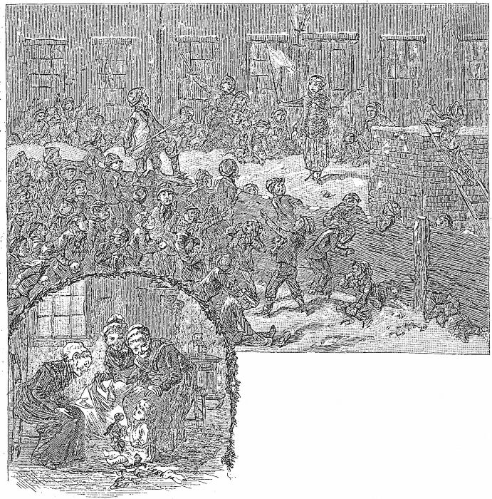 Over the snowy hills they rushed, slipping, falling, and scrambling to their feet again; swarming up the fence, to be knocked off by well-directed blows; crawling under the fence in hopes of catching an enemy by the legs, and being caught by the heads themselves, or making narrow escapes, leaving behind them locks of hair, and taking away scratches and bruises.