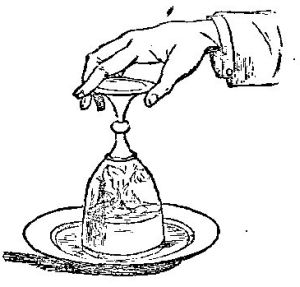 Fig. 1 is an illustration of centrifugal force, or the tendency of a body revolving rapidly around a fixed centre to fly off from that centre. A tumbler is placed upon a round piece of card-board, to which strings are attached so that they hold the glass firmly in place. Some water is poured into the glass, and it can then be swung round the head without the water being spilled, even when the glass is upside down. For the experiment shown in Fig. 2 a wine-glass, a piece of cork, a plate, and some water will be needed. Pour the water on the plate, light a piece of paper resting on the cork, and cover the flame with the glass turned upside down. What follows? The water rises in the glass. The reason is that the burning of the paper having consumed a part of the oxygen in the air, its volume is diminished, and the pressure of the outside atmosphere forces the water into the glass.