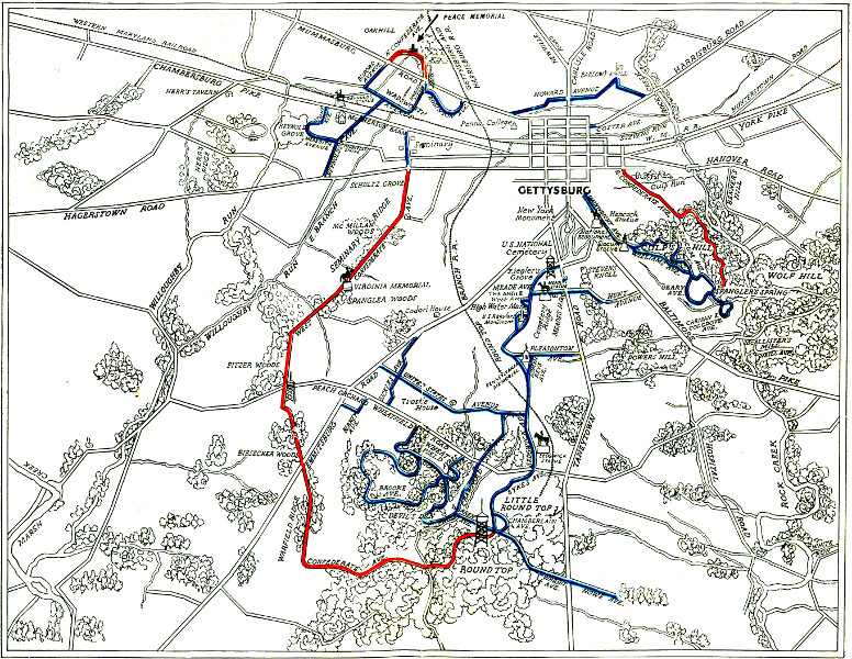 According to official records, the Gettysburg campaign of 1863 began on June 3rd and ended on August 1st. No effort will be made to describe the movements, counter-movements, and fifty minor engagements that occurred before the armies crossed the Mason and Dixon’s line and finally concentrated at Gettysburg, where they engaged in battle on July 1st, 2nd, and 3rd. It is necessary, however, that the visitor should understand the approach to the field.