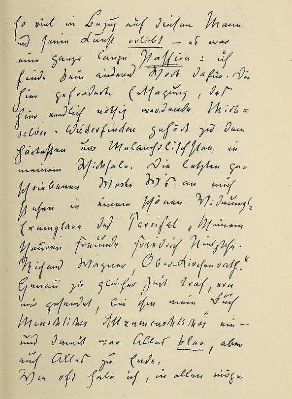 Ich habe viel an Sie gedacht und im Geiste so mancherlei des Erhebenden, Rührenden und Heiteren mit Ihnen getheilt, daß ich wie mit meiner verehrten Freundin verbunden gelebt habe. Wenn Sie wüßten, wie neu und fremdartig mir alten Einsiedler das vorkommt!—Wie oft habe ich über mich lachen müssen! Was Bayreuth betrifft, so bin ich zufrieden damit, nicht dort sein zu müssen; und doch, wenn ich ganz geisterhaft in Ihrer Nähe sein könnte, dies und jenes in Ihr Ohr raunend, so sollte mir sogar die Musik zum Parsifal erträglich sein (sonst ist sie mir nicht erträglich.)