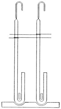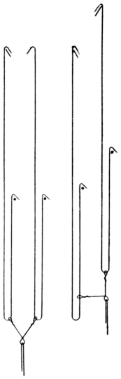 The next hook, as shown in Fig. 2, was flat. This also rested on a perforated board, and, to assist in keeping the hook in position, [Pg 3] the needle was twisted around the hook. This kind of hook and needle required too much time and labor when one had to be replaced.