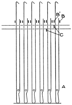 The illustration, Fig. 3, shows the next form of hook that was used, and which is used at the present time in many French machines. This also rested on a perforated board. The chief object of this hook was to remove the necessity of having springs to force back the needles. At the point marked A, a rod passed through the hooks from one side of the machine to the other, which kept the hooks quite firm. Near the top of the hook at positions B and B¹, two more rods were placed, one being at the back of the hook and the other at the front, the bottom of the hook being held firmly, while the rod B pressing against the back portion of the hook caused a certain amount of spring.