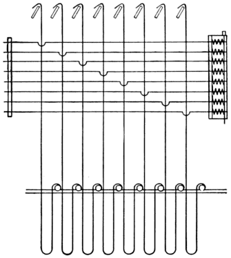 A lingo, usually made of various weights of wire and which is at the extreme end of the coupling; a double thread, commonly [Pg 2] termed a hanger, which attaches the lingo to a mail eye; and the mail eye, through which the warp yarn is passed. When there are four parts, a double thread termed the mid-piece or sleeper is attached to the top of the eyelet and is then fixed to the harness threads mentioned at e.