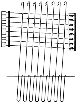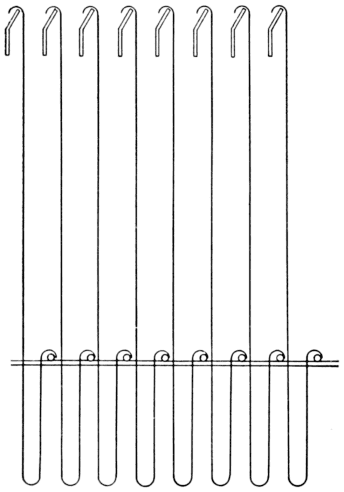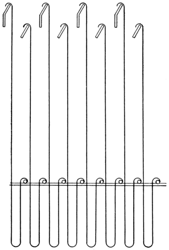 When the cotter has been placed through the loop of the needles, the hooks are placed in among the needles. The first hook is pressed through the half circle of the needle and passes on the outside of the others, which keeps the hook in position. The second is placed through the half circle of the second needle, but [Pg 12] passes on the outside of the first needle and on the outside of the lower needles. This rule is followed out until the eighth hook is placed in position.