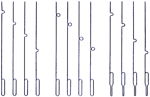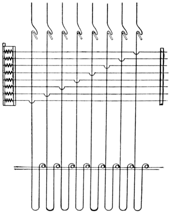 The needles and hooks used in this kind of machine are shown in Fig. 23. Each needle has two eyes or curves. The reason for two eyes is as follows: There is but one cylinder and two griffes, one of which is descending while the other is ascending. The cylinder has to pass in for every pick; that is, for each lift of the griffe, which necessitates the use of double the number of hooks; so that in a 400-machine, there are 800 hooks, without the extra ones. The top bend of every hook is turned in the same direction, that is, toward the needle board.