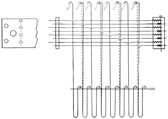 [Pg 13] When all the needles and hooks have been placed in the machine, the frame, in which the bars that support the top of the needle are fixed, must be made perfectly straight with the needle board. If they are not straight with each other, there is endless trouble with the machine. In the first place, the loop of the needle presses down the spring when the needle is forced back by the card, instead of pressing the spring back straight in the box. This will cause the springs to wear out sooner and they will often stick, preventing the hooks from being lifted.