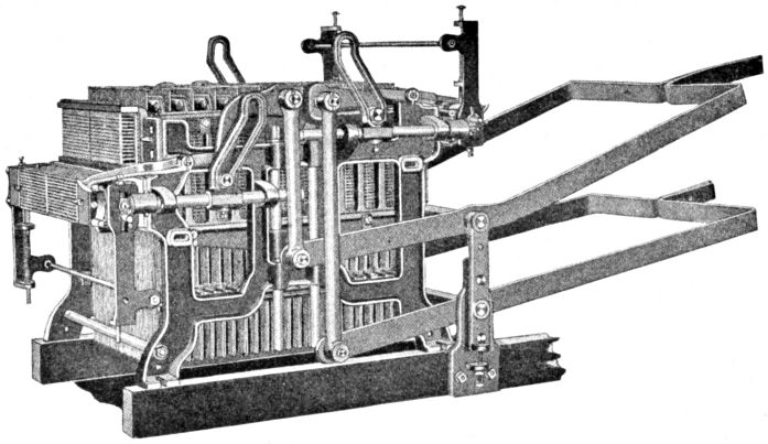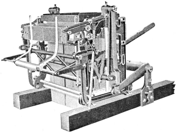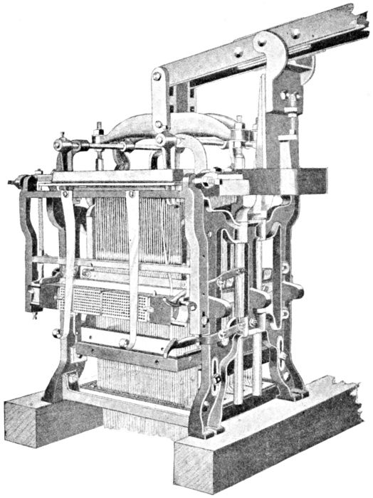 The illustration, Fig. 9, shows a jacquard known as the Single Action Machine. The chief feature of this machine is that the same griffe lifts the hooks for every shed, so the griffe must descend before the next shed can be lifted. This allows all the yarn to be lifted from the bottom shed. The single action machine is convenient and well adapted to work when a [Pg 8] high speed is not required; ninety to one hundred thirty picks per minute being the most suitable speeds.
