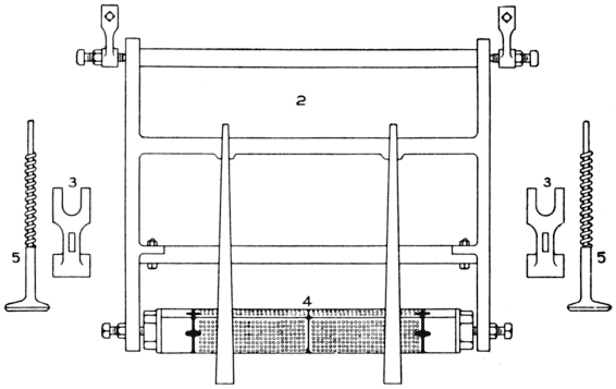 [Pg 17] (e) A spring hammer, the flat end of which rests on the casting on the end of the cylinder. What might be termed the handle of the hammer passes through the lower cross rail of the bottom frames and through the top frame. A spring is placed between the two rails and around the handle of the hammer. The object of the hammer is to keep the cylinder perfectly level so that the cylinder will strike the board level.