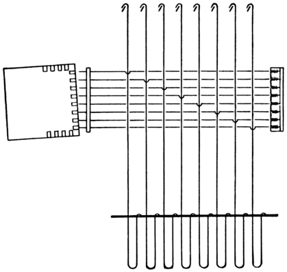 In most of the jacquard machines used at the present time, the griffe has been lowered to within approximately one inch of the top of the needles and the hooks have been made of stronger [Pg 7] material (shown in Fig. 8), enabling a more compact machine to be made.