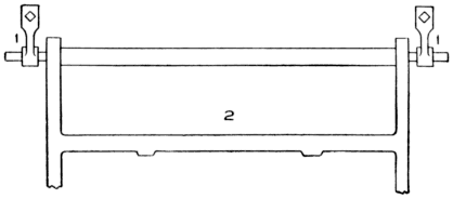 (c) Two cups set in the batten frame, which support the cylinder. The cups are made of iron or brass and are held in place by a bolt with thumb screw on the outside of the frame of the batten. Set into the bottom of the batten frame and pressing upwards against the cups, are two set screws whose purpose is to raise or lower the cylinder.