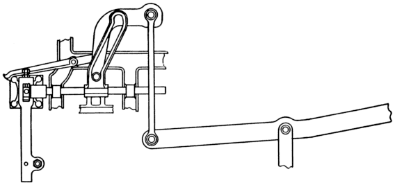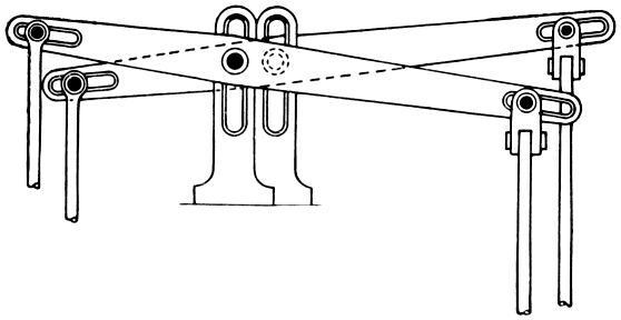 The top lever lift is considered by many to be the best method of operating the griffes, and this method can be used whether the harnesses are attached by the straight tie or the cross tie system. All that is required to be changed is that where as in the straight tie both the levers are on the same stud, and fixed to one support, the levers for the cross tie are placed on separate studs with separate supports. The reason for using separate supports and studs is to meet the different positions of the griffe bar. (See Fig. 28.)
