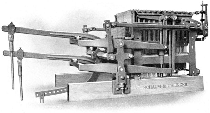 This means that there are two griffes and two cylinders. The same methods are used to operate the moving parts, as are used on the single action machines, but the lever and arms are used in a compound manner. This machine is undoubtedly the best, where large reproduction is aimed at, for it can be run 170 or 180 picks per minute. The illustration, Fig. 24, shows a double action machine.