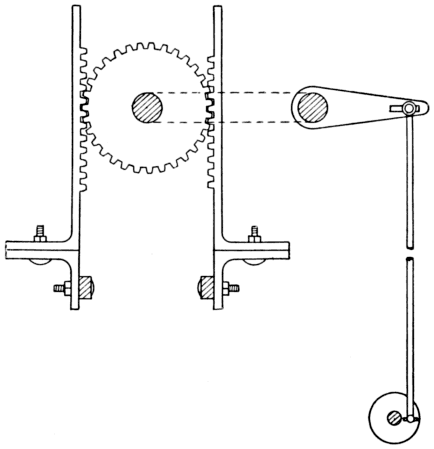 In Fig. 30 the pulley A is supported on a shaft in the same position as the gear for the rack motion, and to the pulley a strip of belting B is attached, each end being fixed to the cross rail of the griffe at C. The belt motion is a simple arrangement, but the griffe must act freely and perfectly straight or the griffe will not descend low enough to allow the hooks to be pressed off by the cylinder.