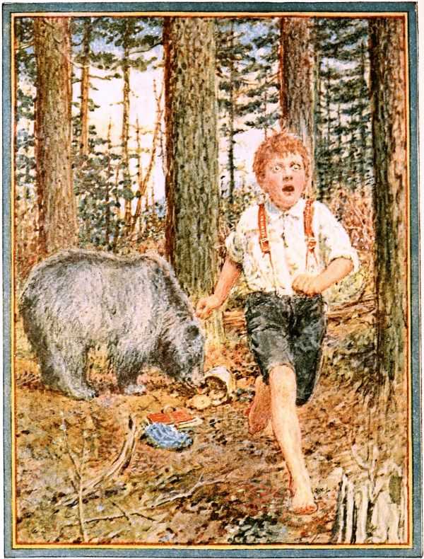 Buddy Jim's basket was almost full of the fragrant Fir tips, and he was just going to whistle for Old Dog Sandy, to come home with him, when there was a dreadful commotion from [Pg 17] inside of the Fir thicket. It was Old Dog Sandy barking for all he was worth, in a way that Buddy knew meant, "Come here, quickly, and see what I've found!"