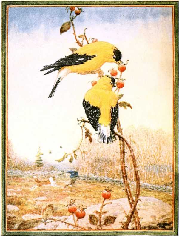 He was a happy old dog as they ran across the crisp fields; there were flocks and flocks of bright-colored thistle birds, [Pg 83] chattering and getting their breakfast of seeds from the weeds, but old Dog Sandy didn't count those. They were too small and besides, they were just like the canary that Mary the cook kept in a cage, and made so much fuss over every day. It was a bit more exciting when he picked up Molly Cotton-tail's trail—but of course Buddy whistled him back—he never could have any fun.