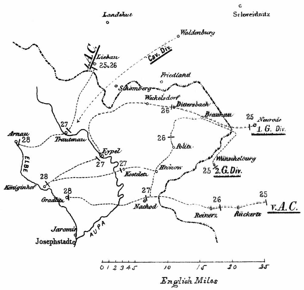 Before the commencement of hostilities Von Benedek had, as we have seen, announced his intention of invading Prussia. Two routes offered themselves to his choice: one by way of Görlitz and Bautzen to Berlin; the other by way of the valley of the Oder into Silesia. The latter route was obstructed by the fortresses of Glatz, Neisse and Kosel; the former would have led to the unobstructed occupation of Saxony, and would have enabled the Bavarian army to concentrate, via the passes of the Saale and Wittenberg, with the Austrians and Saxons. But, at a time when minutes were worth millions, Von Benedek was slow; and the preparation and energy of the Prussians enabled them to take the initiative and throw the Austrians upon the defensive in Bohemia. Von Benedek then decided to concentrate his army in the vicinity of Josephstadt and Königinhof; to hold the strong defiles of the Iser or the Elbe with comparatively weak detachments, and throw his main army upon the Crown Prince or Frederick Charles, as circumstances might decide.