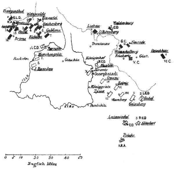 [7] It should be remembered that, in addition to the four corps immediately opposed to the Crown Prince, the IIId and IId Austrian Corps were at Von Benedek’s disposal; the latter being scarcely more than two marches distant from Josephstadt.
