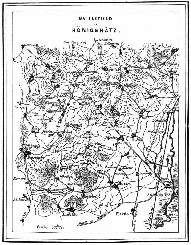 As to the narrative portion of the book, no other claim is made than that it is based upon the story of the campaign as given in the Prussian Official History of the Campaign of 1866, Hozier’s “Seven Weeks’ War,” Derrécagaix’s “La Guerre Moderne,” and Adams’ “Great Campaigns in Europe.” I have not deemed it necessary to cumber the pages with notes of reference, but will here express my indebtedness to the works mentioned, giving precedence to them in the order named. Other works have been consulted, which are enumerated in the bibliographical note at the end of the volume. I have also personally visited the scene of the operations described, and, especially in regard to the topography of the battle field of Königgrätz, I am able to speak from my own observation.