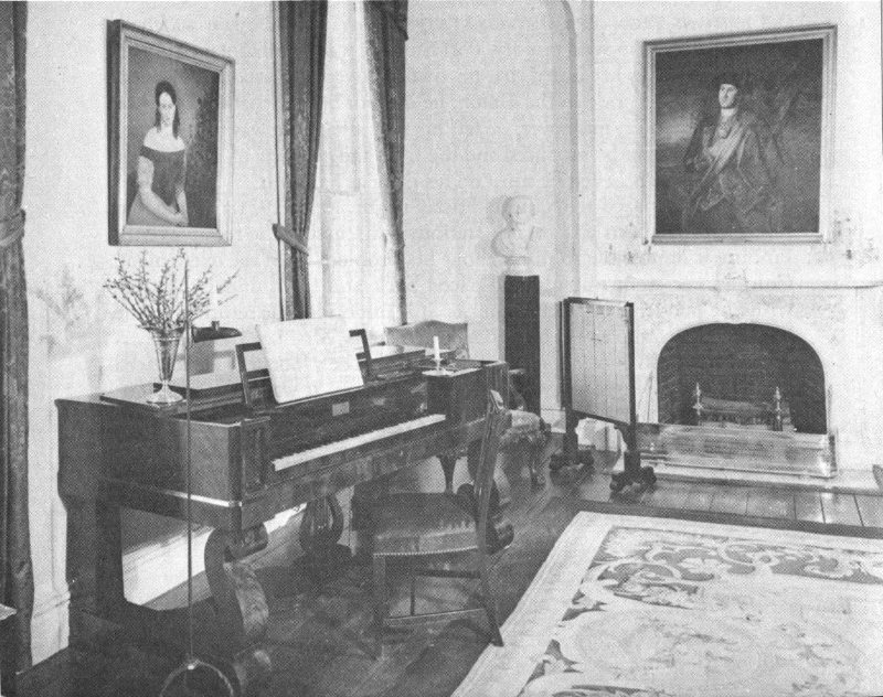 The most valuable paintings were taken away by Mrs. Lee in 1861, but copies have been made for the restoration of this room. The sofa is 34 original, as is the music cabinet near the piano. The woodwork and walls are finished off as Colonel Lee had them done in 1855.