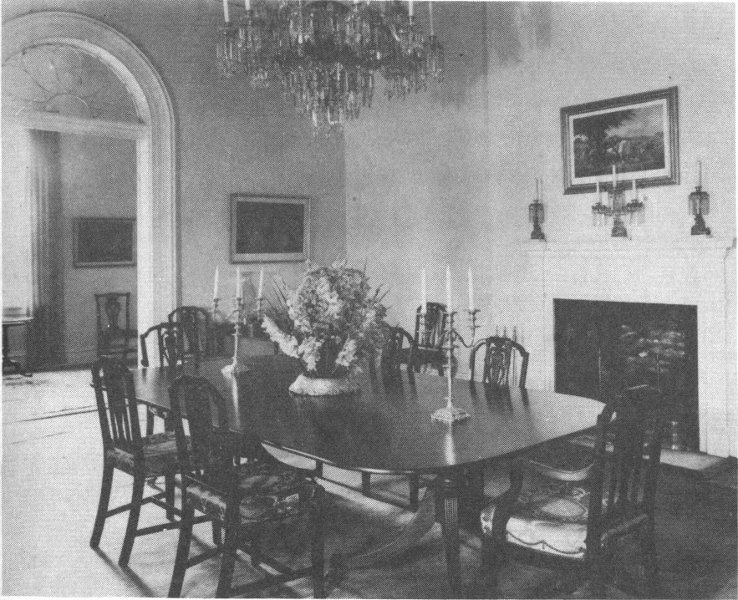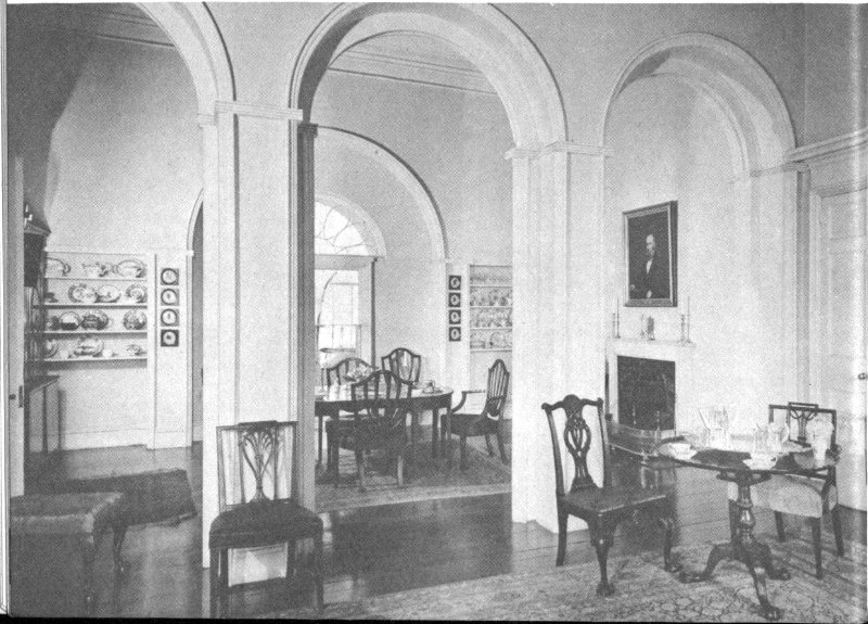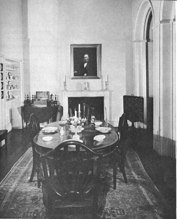 The dining room has been restored to its earliest use. Most of the woodwork and windows are original, while the molding, plaster, and the beautiful door to the study are entirely so. An interesting architectural feature is the great semicircular arch at the north end of the room, reminiscent of the villas Architect George Hadfield saw in Italy during the years he studied there.