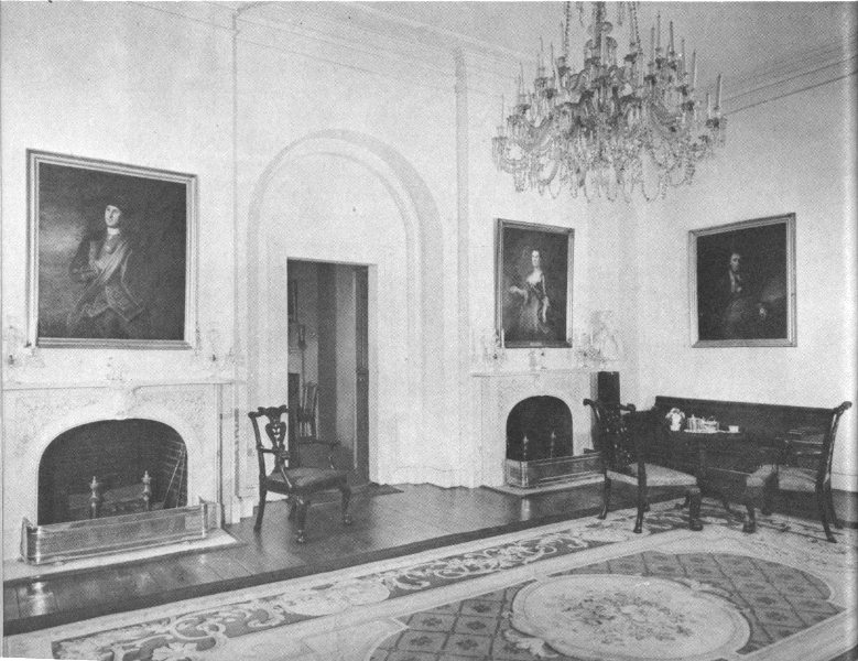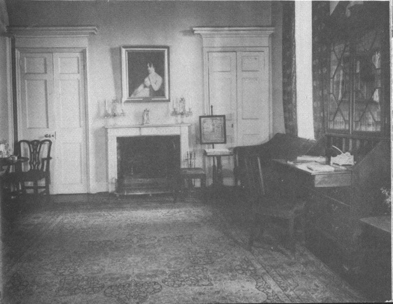 THE DRAWING ROOM. The drawing room remained unfinished for many years, not even being plastered, probably because Mr. Custis lacked the necessary funds. During these years it was known as the “big room” and in it were stored old furniture and the finished canvasses of Mr. Custis. On rainy days the Lee children often used it as a playroom. When Colonel Lee went to Texas, in 1855, he left instructions for its “renovation”—plastering the walls, installing a crystal chandelier, and painting the walls and woodwork. He also ordered marble mantels for the fireplaces. Mrs. Lee supervised the progress of the work in her husband’s absence, and the result must have been most pleasing, for a young lady who saw it in 1856 describes it as “a beautiful & noble drawing room, very handsomely furnished and hung too with paintings.”