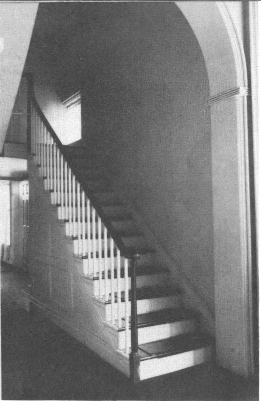THE UPPER HALL. The simple staircase which ascends to the upper hall is typical of those in houses of classic revival style of architecture, since their temple prototypes had no second floor and hence no stairs. That the one in the mansion was carefully planned by the architect, however, is shown by the ingenious way in which one window serves to light the stair landing and the closet off it, as well as the hall below.