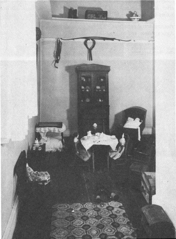 Like the one below, the upper hall was originally furnished with several long sofas for use as a sitting room during warm weather. At such times the lower part of the great window at the west end was opened wide in order to increase the movement of air.