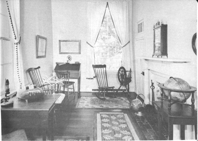 THE SCHOOLROOM. This may have been Mrs. Lee’s bedroom when she was a little girl and her parents occupied the adjoining rooms. After the main part of the house was built, it was used as a sewing room and a schoolroom for the Lee children and those of the house servants. The old terrestrial globe is one of the most interesting original objects in the mansion, having been found tucked away in the attic under the eaves by workmen repairing the roof some years ago. The small pine table on which it stands is also an original piece. Over the globe is a framed photograph of Comdr. Sidney Smith Lee, brother of Robert E. Lee. The walls and woodwork, like those of most of the rooms, have been restored to their original color.